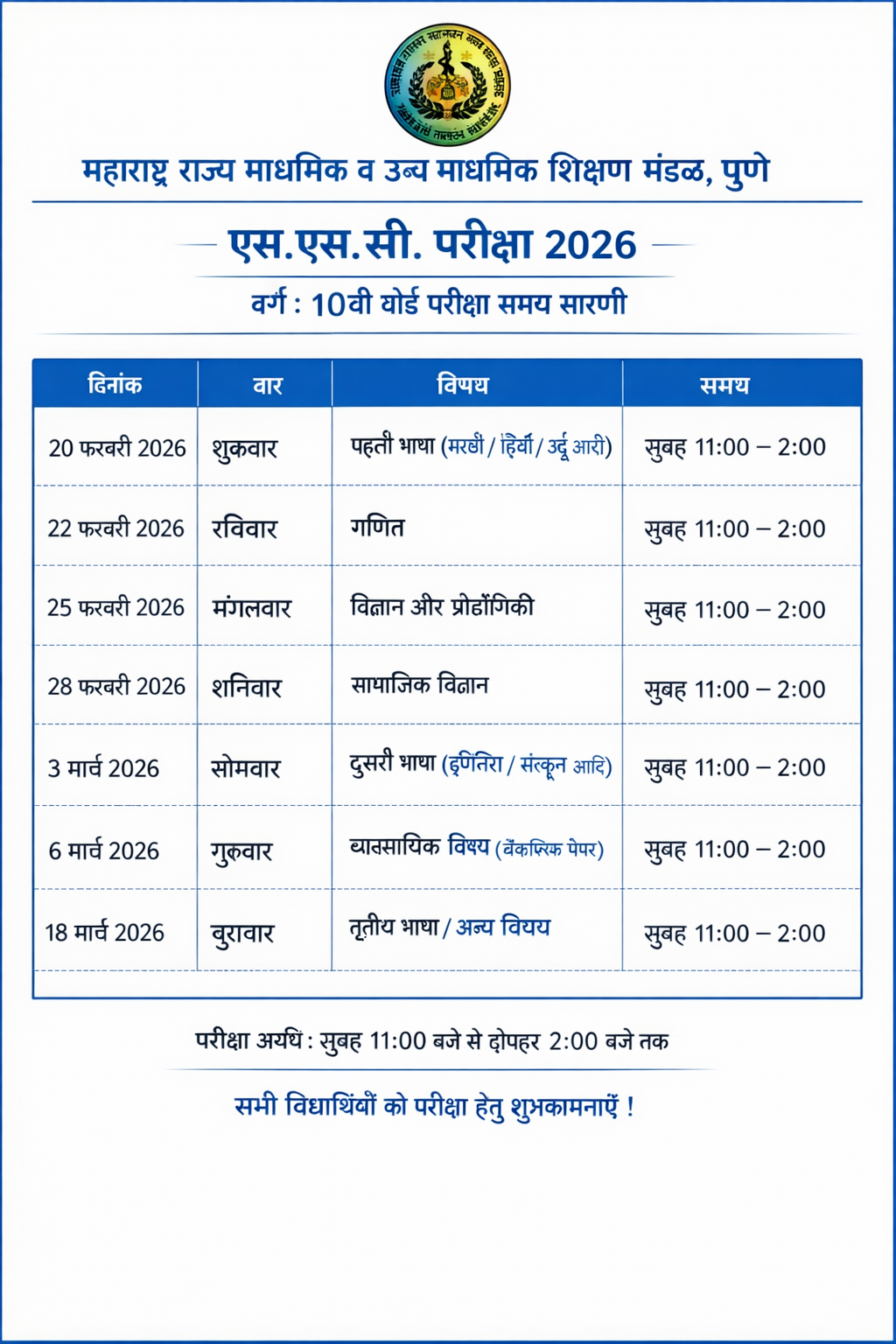 एसएससी बोर्ड परीक्षा का टाइम टेबल आमतौर पर दिसंबर 2025 या जनवरी 2026 में जारी किया जाता है। टाइम टेबल जारी होने के बाद छात्रों को यह स्पष्ट हो जाता है कि किस विषय की परीक्षा किस दिन होगी। इससे छात्रों को अपनी पढ़ाई की योजना बनाने में आसानी होती है।