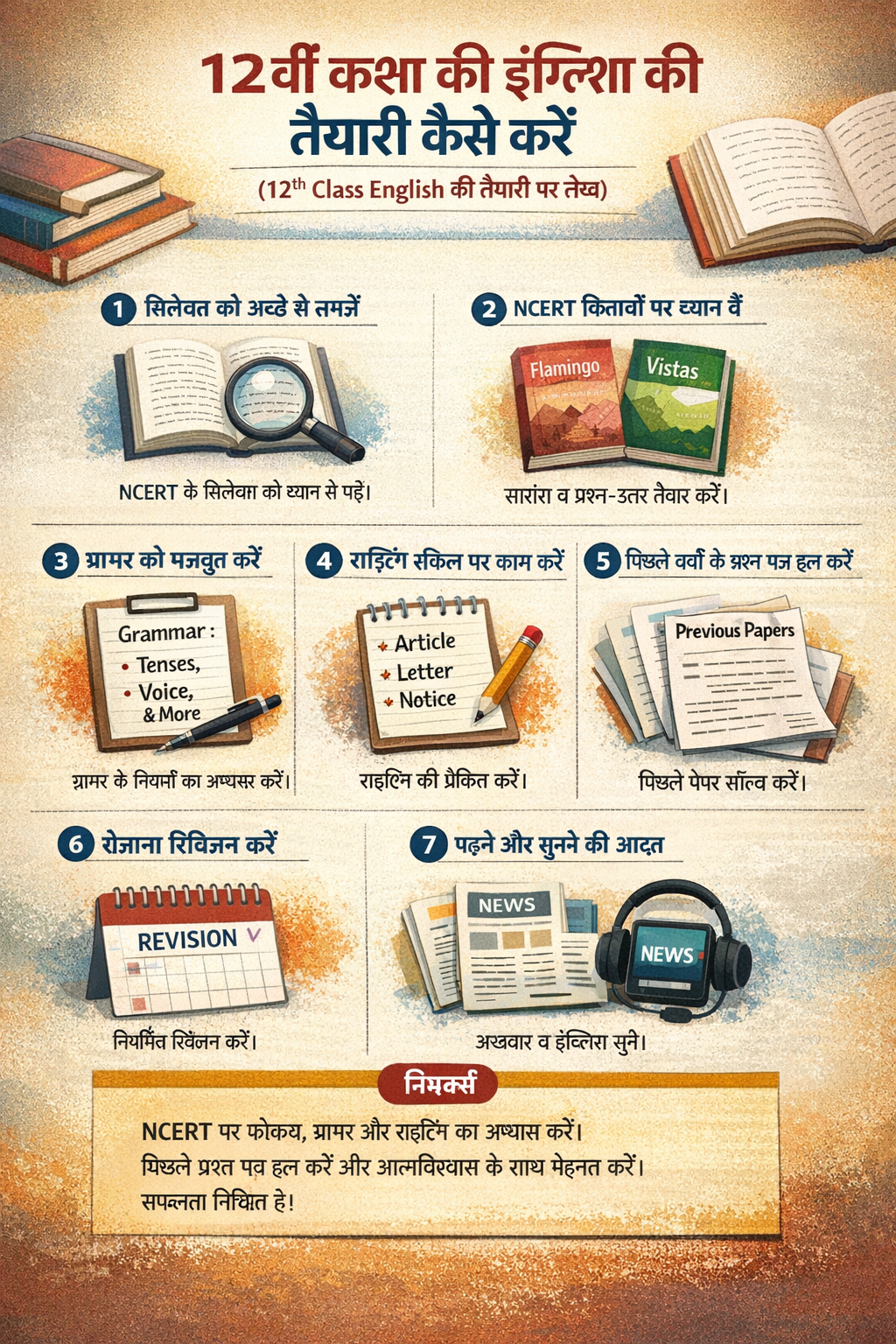 Sabse pehle NCERT ke latest syllabus ko detail mein samjhein। Flamingo aur Vistas ke chapters, poems, grammar aur writing section par focus karein। Jab syllabus clear hota hai, tab preparation easy ho jaati hai।