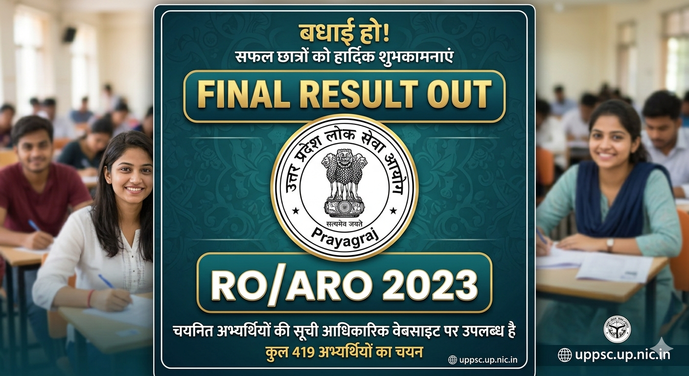 UPPSC RO-ARO Result 2023: उत्तर प्रदेश लोक सेवा आयोग (UPPSC) की तैयारी कर रहे युवाओं के लिए बड़ी खुशखबरी सामने आई है। आयोग ने समीक्षा अधिकारी (RO) और सहायक समीक्षा अधिकारी (ARO) परीक्षा-2023 का अंतिम परिणाम घोषित कर दिया है। लंबे समय से इस रिजल्ट का इंतजार कर रहे अभ्यर्थियों का इंतजार अब खत्म हो गया है। आयोग द्वारा जारी आधिकारिक सूची के अनुसार, कुल 419 पदों के सापेक्ष 419 उम्मीदवारों का चयन किया गया है।